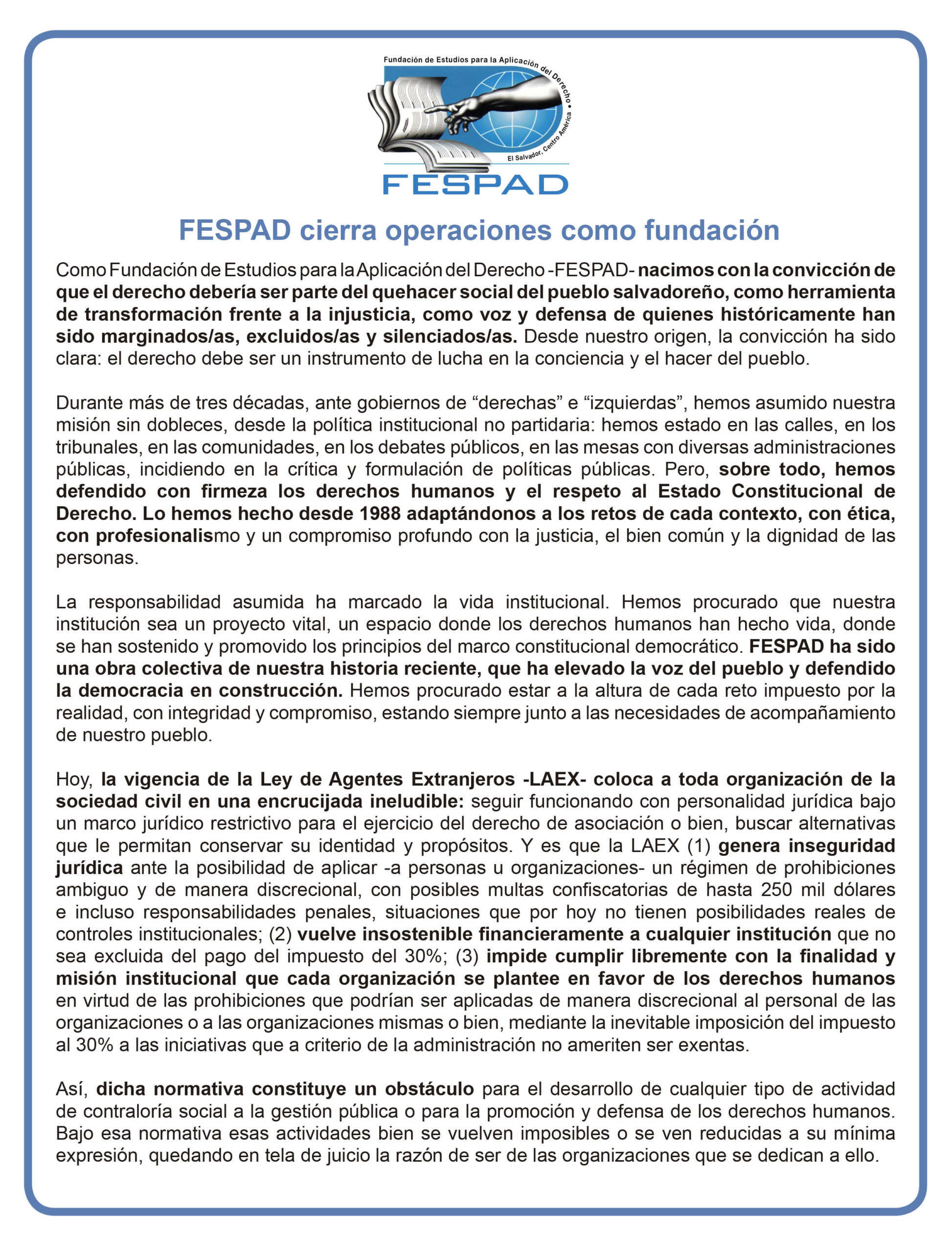 Comunicados Comunicado | FESPAD 36 años: Derechos humanos para la justicia, la igualdad y la libertad 29 noviembre, 2024